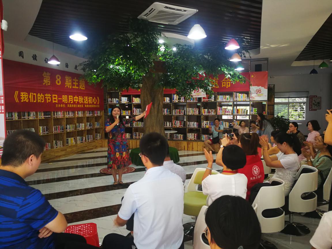 当日下午,各朗读爱好者陆续在江城社区集合,首先由菜园头社区党支部书记杜玥同志为大家致辞,接下来,来自市政府、市洋澜湖电排站、市水务集团等13个单位的朗读爱好者依次登台,围绕“我们的节日 明月中秋话初心”主题为现场观众朗诵。其中,来自市政府、市洋澜湖电排站的朗诵者以饱满的激情、富有感染力的语言以及大方得体的举止获得现场观众的一致好评。活动后,主办方为各朗诵爱好者送上月饼作为礼物,并拍照留念。