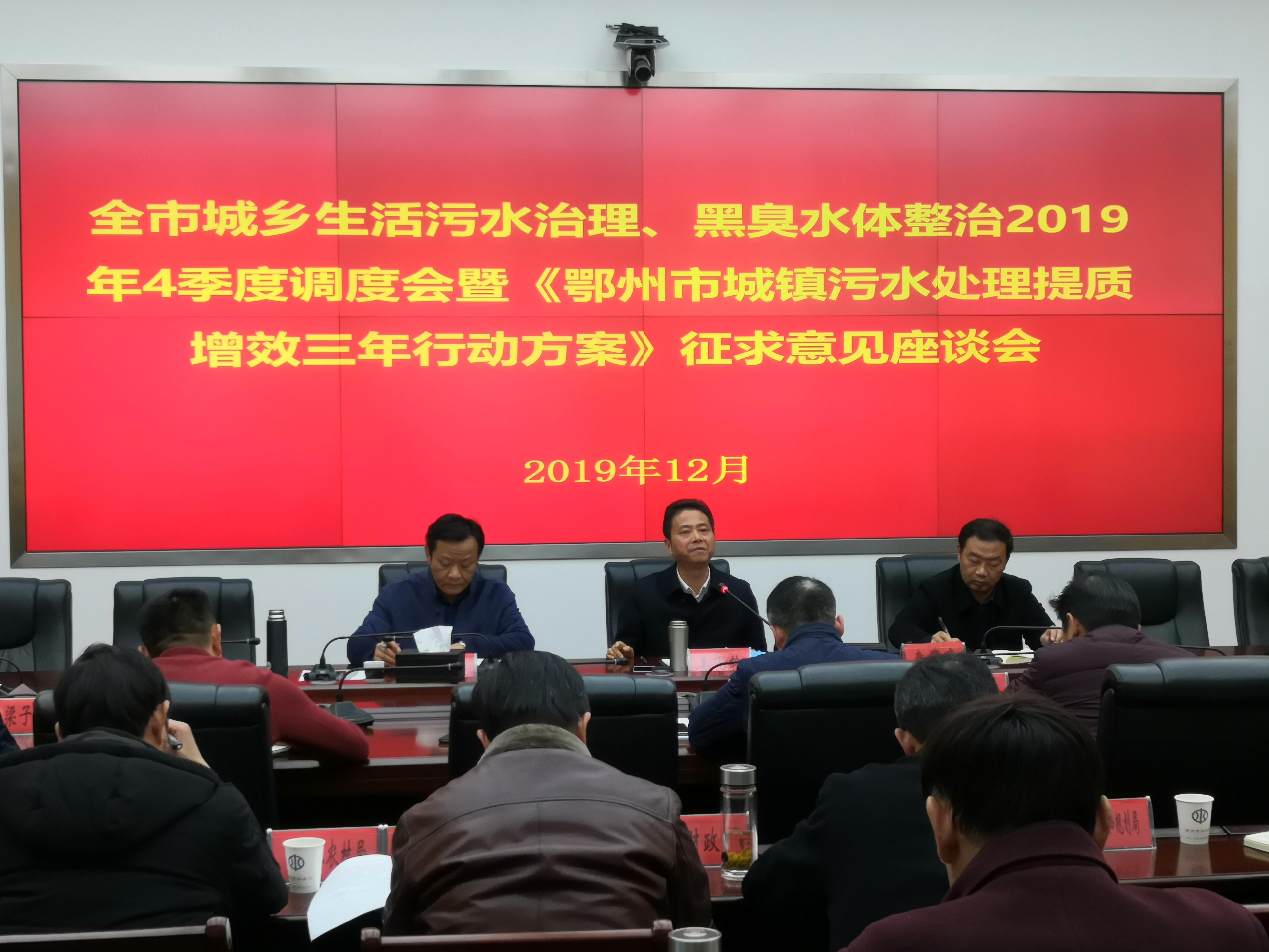 (局供排水科熊硕供稿)2019年12月17日,副市长姜飞轮在網上娛樂城八楼会议室召开全市污水治理、黑臭水体整治2019年4季度调度会暨《鄂州市城镇污水处理提质增效三年行动工作方案》征求意见座谈会。会上,網上娛樂城展示了第四季度黑臭水体整治、污水治理巡查问题,通报了2019年度鄂州市黑臭水体整治、污水治理工作情况,提出了2020年工作建议,各地、各市直相关单位分别汇报了2019年度污水治理、黑臭水体整治工作完成情况及2020年工作计划。