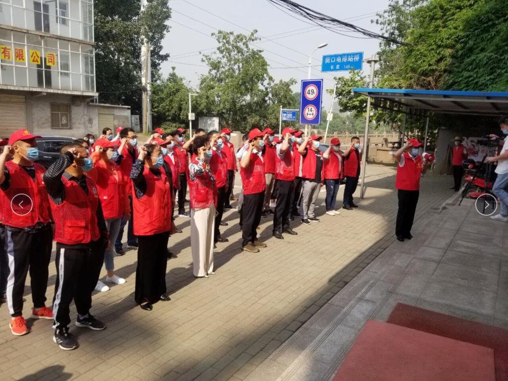 上午 8:30,社区联建单位党员志愿者20余人站成一排排,在社区负责人的带领下,面对党旗和入党誓词,庄严的举起右拳,豪迈地重温入党誓词。