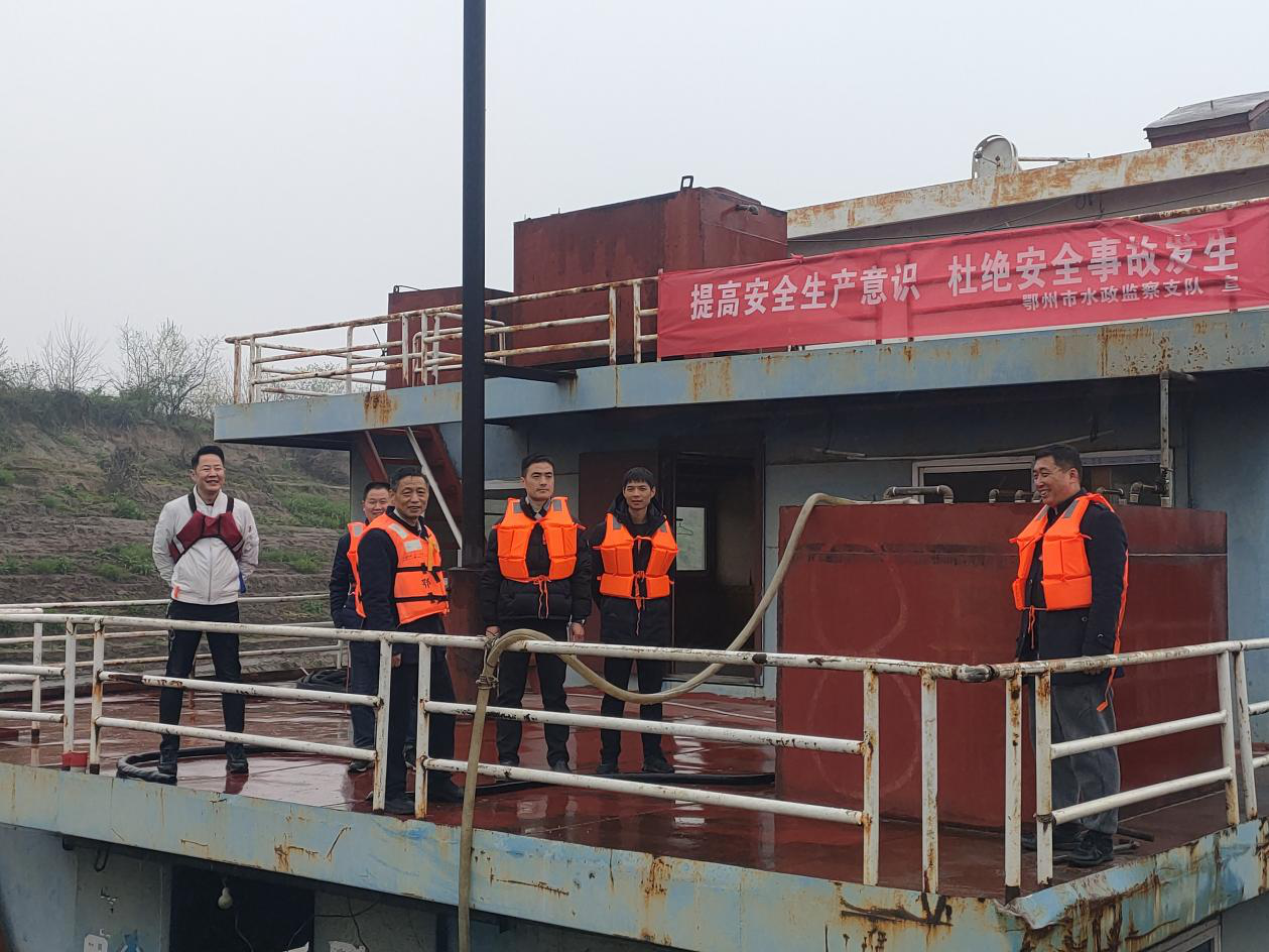 (市水政监察支队供稿)为进一步加强长江鄂黄河段马家滩、人民洲采区现场安全生产综合监管工作,建立规范有序的安全管理秩序,确保采区顺利开采。3月20日-21日,市水政监察支队安全生产分管负责人李振山同志一行对采区作业现场进行安全生产工作检查。检查了施工作业采砂船舶和运输船舶集中停靠点以及船上救生圈、救生衣等设备的配置情况。并督促业主方、劳务方提高安全生产意识,完善安全措施,清除采砂泵、运输船、吹砂平台安全隐患,按海事部门要求配齐相关工作人员,持证上岗。特殊天气条件下,应听从监管人员调度安排,停止采区作业。