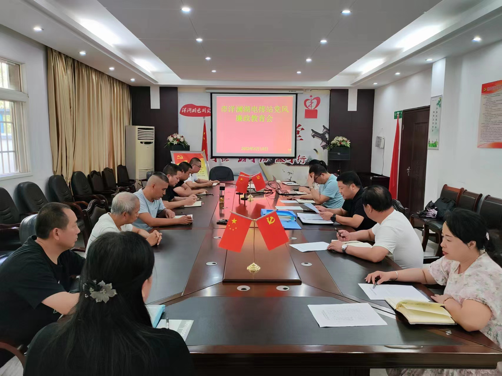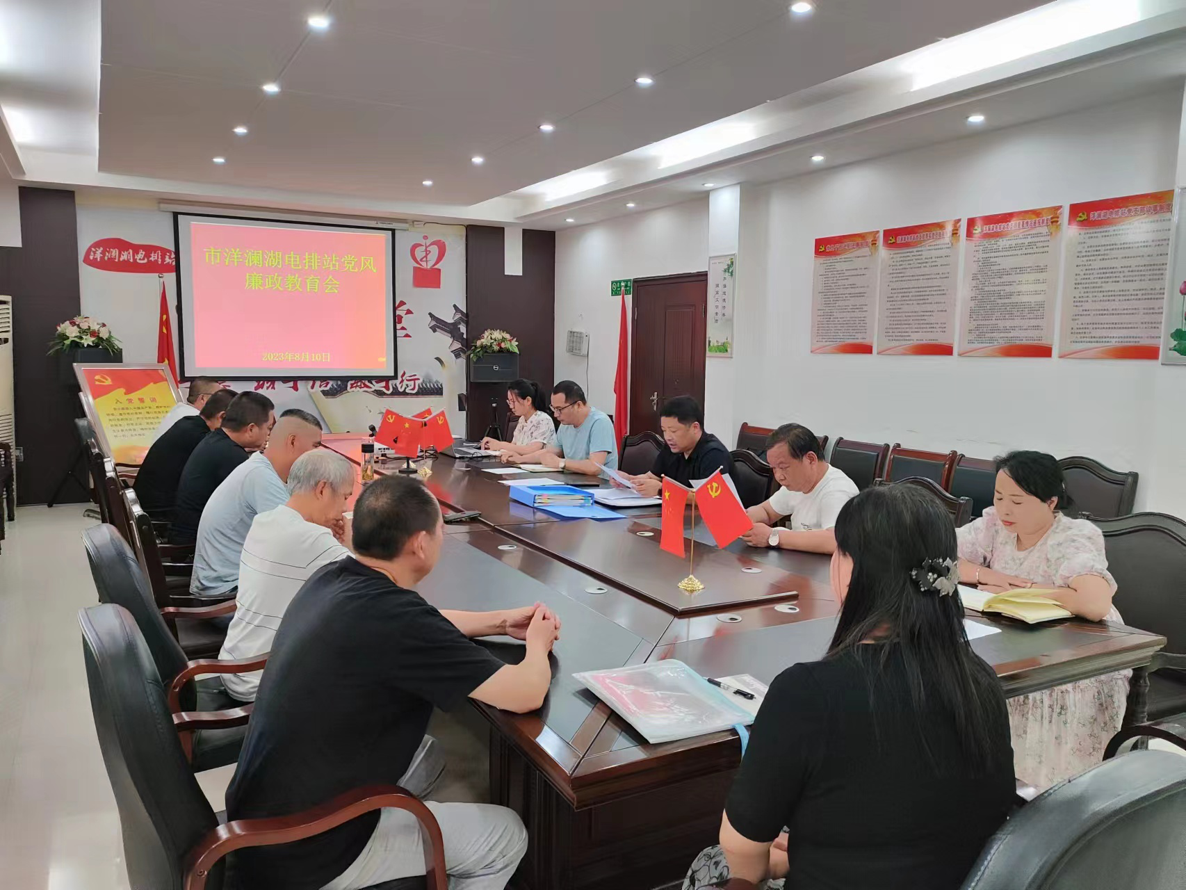 8月10日,市洋澜湖电排站召开党风廉政教育会,党支部主要负责同志给全体党员职工讲授廉政党课,并与党员干部进行集体谈心谈话。