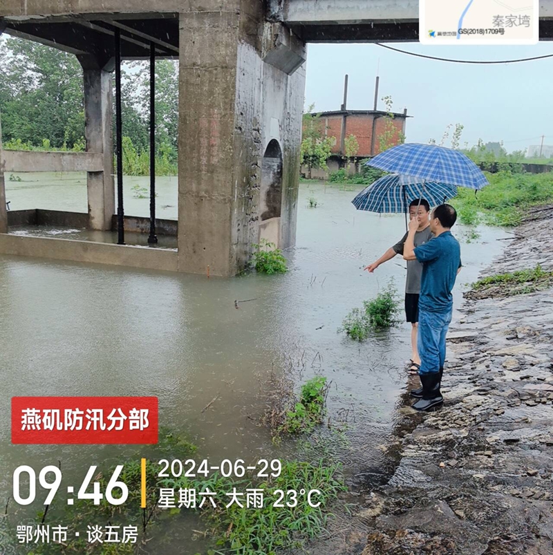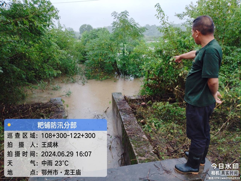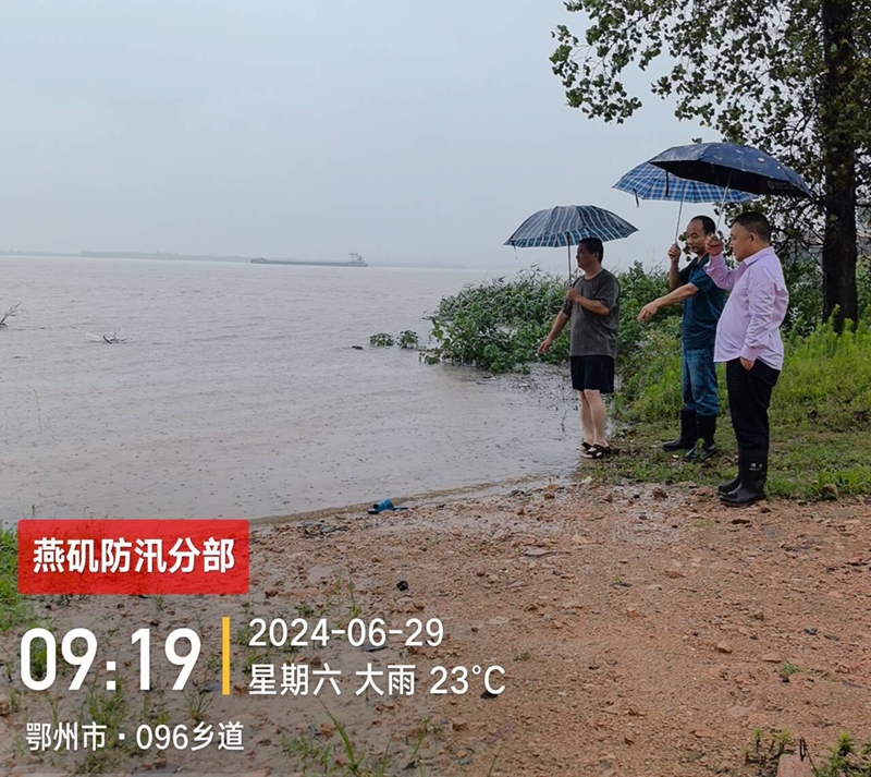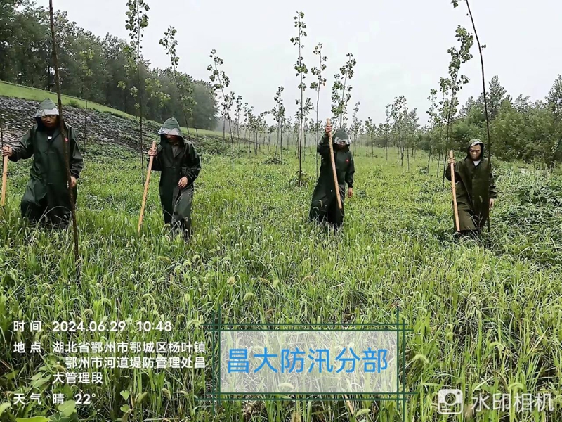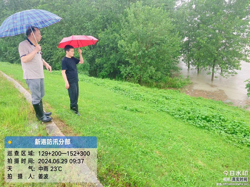 2024年6月29日,长江水位24.56米,超设防水位1.06米。市河道堤防保护中心职工冒大雨开展拉网式巡堤查险工作,重点查看险工险段、涵闸、穿堤建筑物等,全力保障我市长江干堤安全。